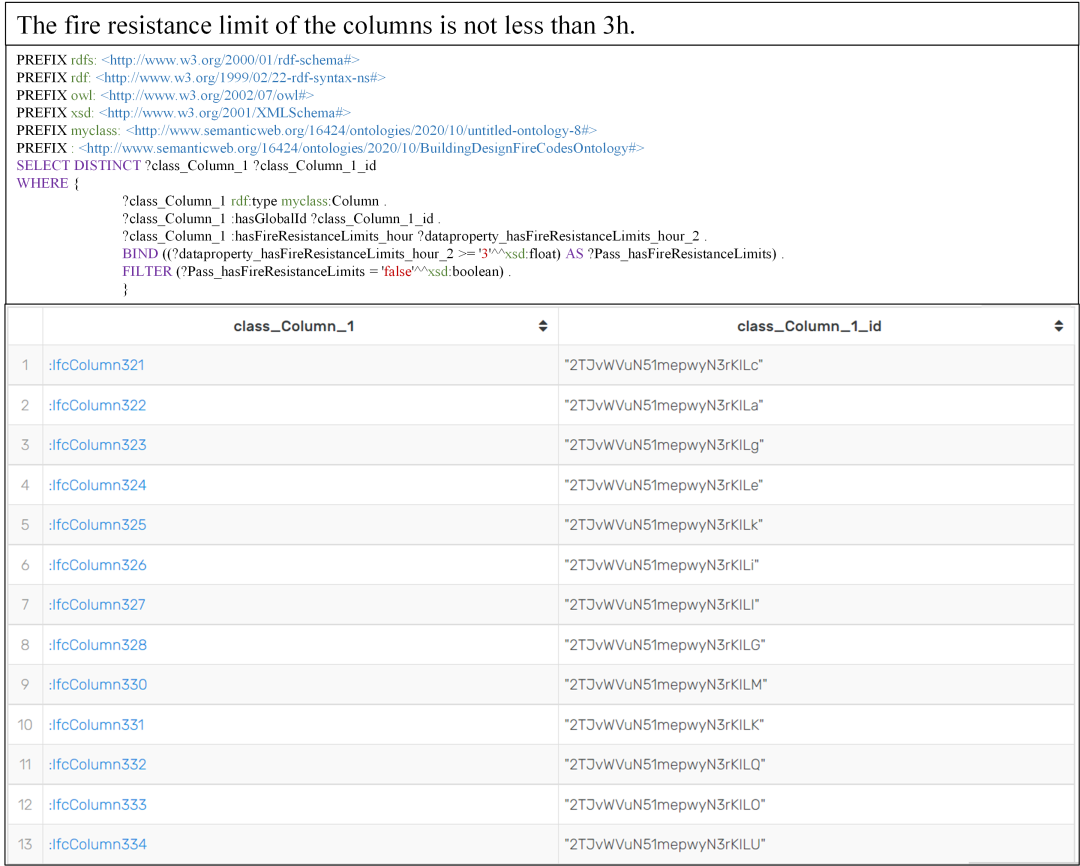 本文中对一个实际工厂建筑实施规则检查,选择三个示例规则,包括一个直接属性简单条文和两个间接属性复杂条文。利用所提出的方法,将规则解译为SPARQL代码,并使用GraphDB执行代码,以检查模型合规性。图5显示了规则解译及模型检查结果,所提出的系统正确进行了规则解译并发现了模型中不符合规范之处。检查结果提供不合规元素的全局 ID,用户可以根据全局 ID 直接定位到不合规的构件。