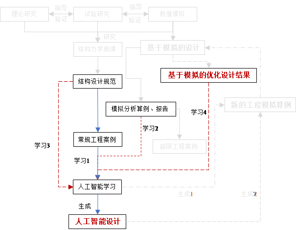 AI技术的发展给了我们巨大的想象空间。我们此前探讨过建筑结构设计领域AI的四种学习路径(参阅:如何更好的融合基于模拟的设计和基于人工智能的设计),本文工作就是探索如何实现图6中的“学习3”学习路径,即直接从规范文本中学习设计的知识。随着AGI(通用人工智能)的发展,或许终有一日,我们画的每一张图,写的每一本报告,编的每一本规范,都将成为AI设计的学习资料,进而推动智能设计的不断进步。