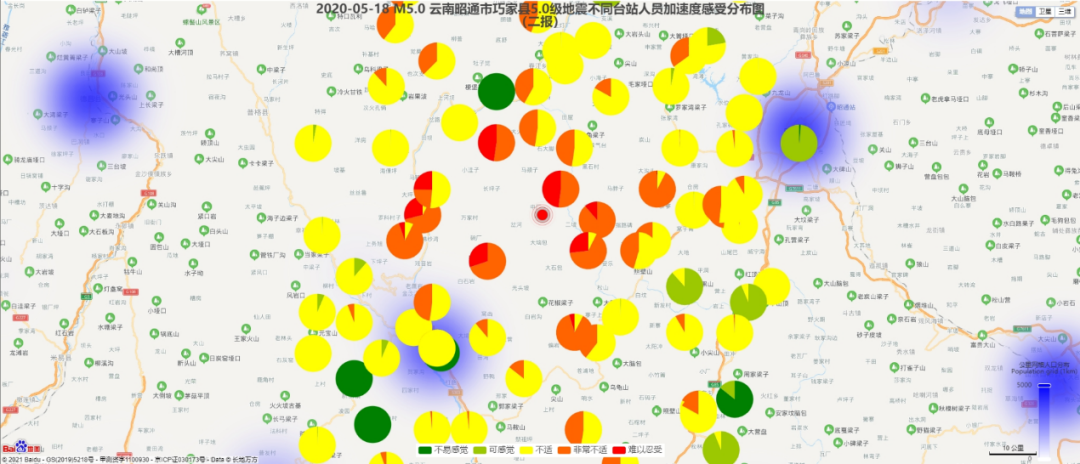 第二批次报告选取全部83组台站记录。图5和图6分别为根据2020年5月18日云南昭通市巧家县5.0级地震震中附近范围内台站记录评估得到的建筑震害分布示意图和人员加速度感受分布示意图(二报)。