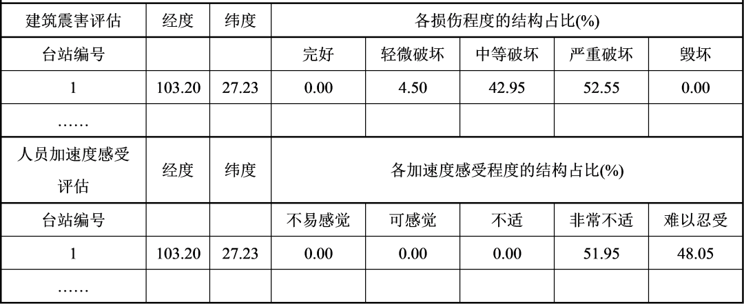 根据本标准的程序和提供的附录参数,以上评估可在获取地震动数据后1小时内完成。该评估给出了详细的建筑破坏状态比例和加速度感受状态,可以满足震后应急评估的迫切需求。