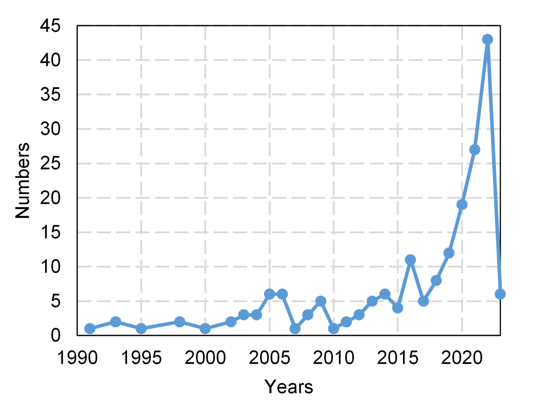 图1显示了AI-based建筑结构设计的研究论文数量变化,可以看到智能设计研究逐年增加,2020年以来增加更加显著。
