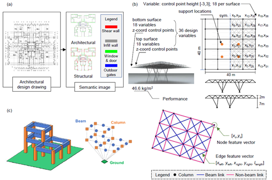 相关研究中对于结构设计数据主要采用张量或者图谱的表达方式,典型数据表征如图3所示(图源详见原文文献说明)。此外,由于结构设计领域公开数据有限,所以广泛应用数据增广方法来解决数据量问题。