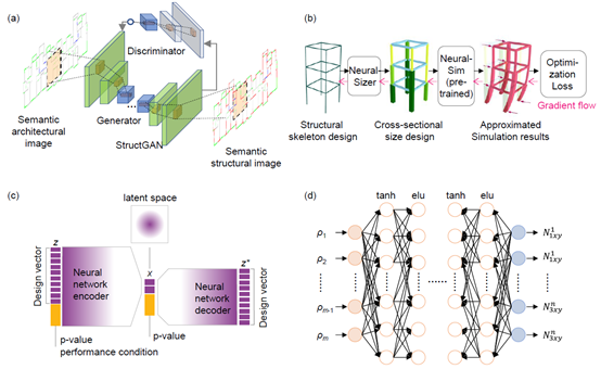 通过文献调研,针对住宅结构,基于卷积网络的生成对抗网络以及图神经网络是主要的生成式AI技术;针对空间结构,主要采用变分自编码(VAE)算法进行智能设计;还有针对梁构件拓扑构型设计,主要采用ANN、CNN等方法为主。典型算法如图4所示(图源详见原文文献说明)。