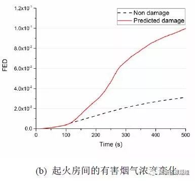 可以看出,考虑震害后,因为喷淋系统功能下降,使得建筑内部烟气浓度和分布范围显著增加(图11),进而可能造成更加严重的次生火灾后果。
