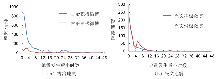 两次地震发生后48小时内积极和消极微博的趋势如图5所示。兴文地震后微博中负面情绪的比例明显高于古冶地震,这与3.1节中的损失情况一致。实验结果表明,地震发生后实时监测微博情绪比例,可以为早期救灾决策提供参考,并有助于估算地震造成的损失。