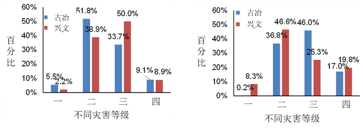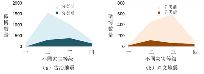 图6 不同灾害等级的微博数量(a)古冶(b)兴文