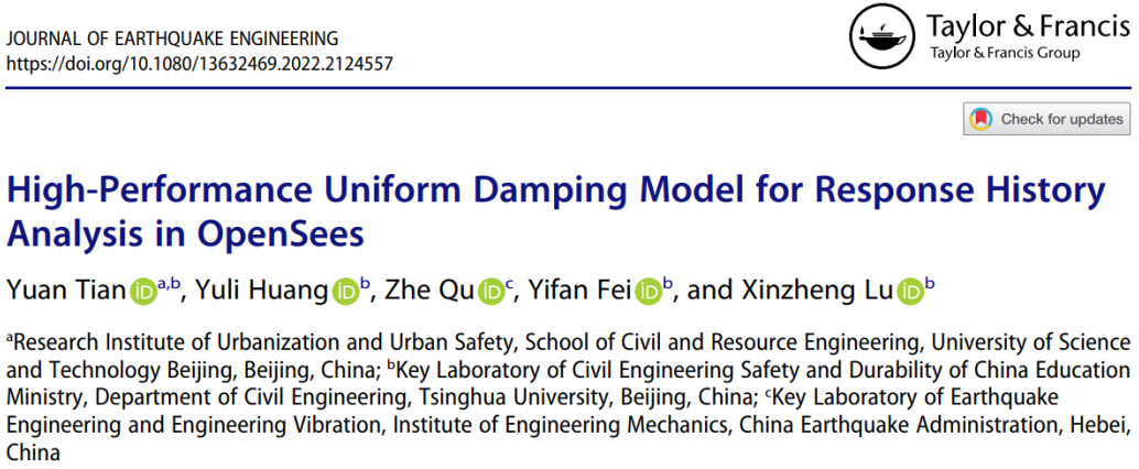 [1] Tian Y, Huang YL, Qu Z, Fei YF, Lu XZ. High-performance uniform damping model for response history analysis in OpenSees. Journal of Earthquake Engineering. 2022.