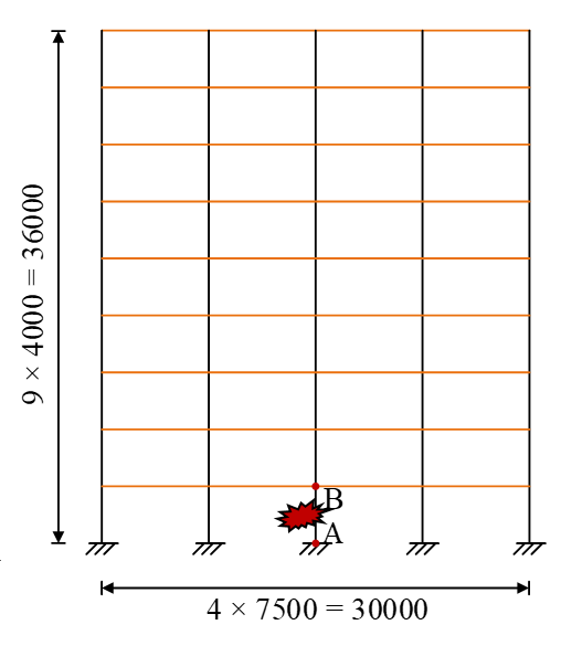 如图是一个由钢梁(阻尼比取2%)和钢管混凝土柱(阻尼比取5%)构成的组合框架结构,重力加载平衡后,突然撤去柱AB,计算点B的竖向运动时程。