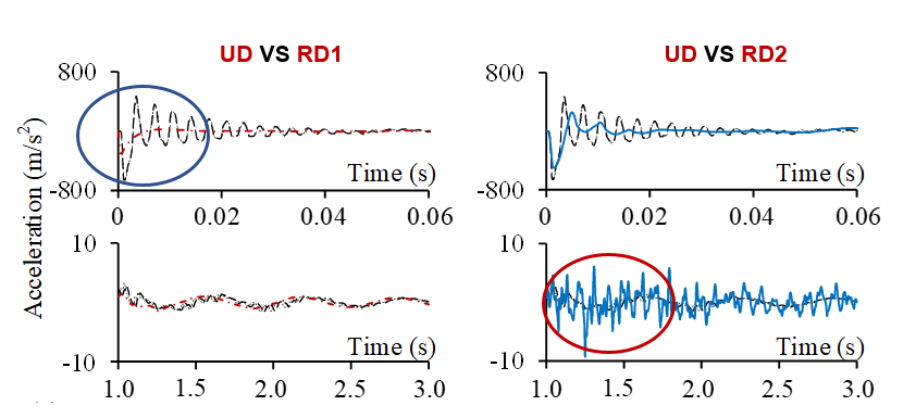 窄频段(RD1)无法把握初始的高频振动;宽频段(RD2)对参考频率区间的振型阻尼比低估明显,在振动后期难以抑制高频
