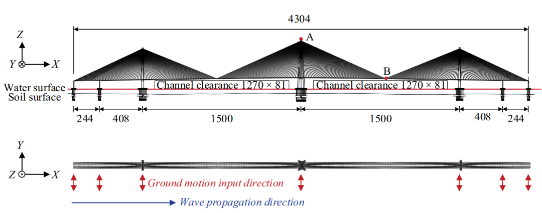 如图是一个大跨斜拉桥,采用非一致激励输入方法,分别采用一致阻尼模型和Rayleigh阻尼进行分析。