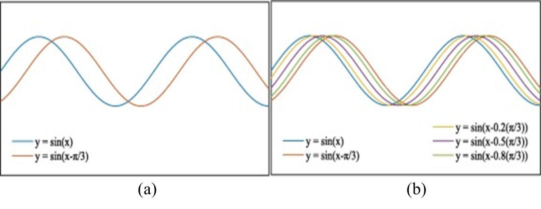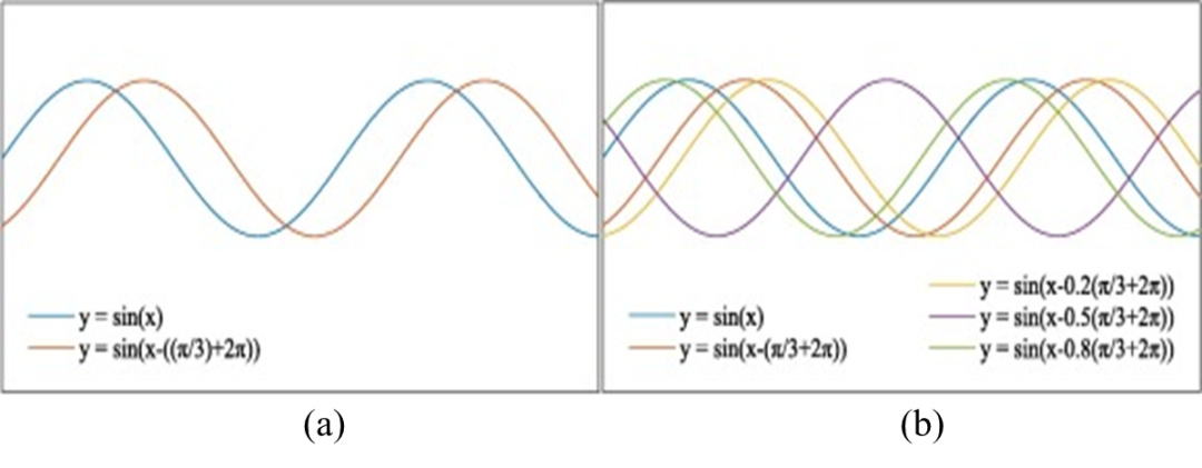 图1(a) 表示一个正弦波方程,以及与其相位差为π/3的另一个正弦波方程, 图1(b) 表示若干经过相位差变换后的正弦波,这些相位差都小于2π,可以发现变化后的各个正弦波之间相位仍旧同步。图2(a) 表示一个正弦波方程,以及其相位差为π/3+2π的另一个正弦波方程, 图2(b)表示若干经过相位差变换后的正弦波,这些相位差中的部分数值大于2π,可以发现这部分的相位已经明显不同步了。这说明在运动稍大的情况,相位阶跃现象对基于相位的方法影响较大,而我们提的两种方法初衷主要为了解决相位阶跃现象,并希望同时解决病态问题和三维估计问题。在这里提一下,相位病态问题指的是:因为相位估计问题是一个逆问题,所以在这过程中,计算噪声和环境噪声容易扩散,最终影响结果。