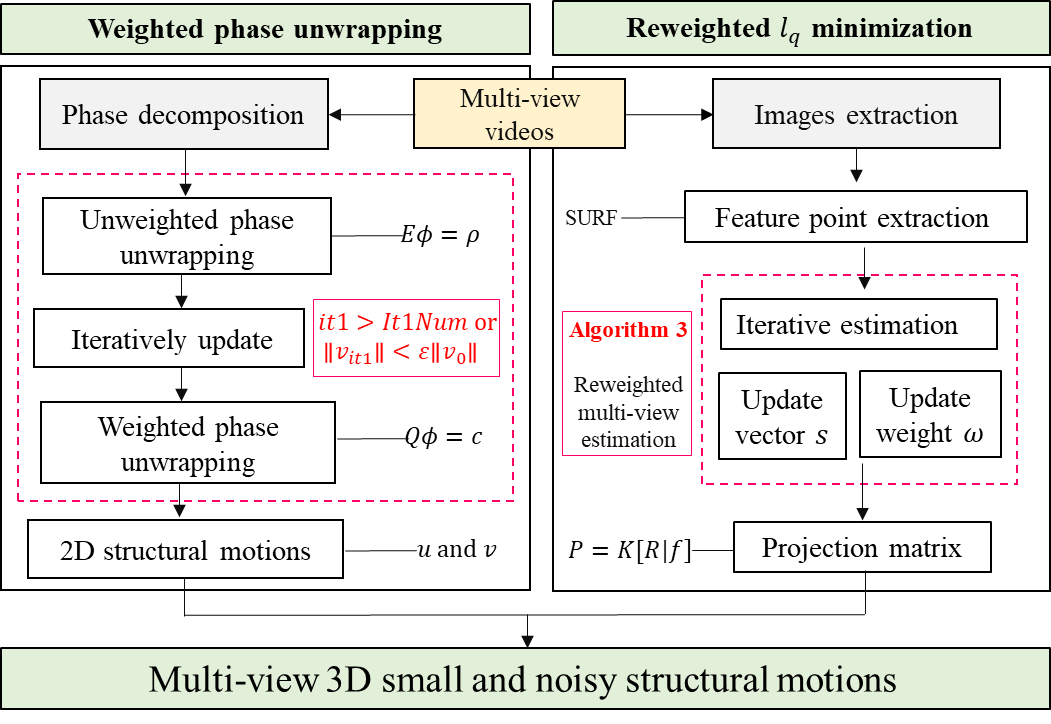 随着计算机视觉技术的发展,越来越多的研究尝试使用基于视觉的方法测量建筑与基础设施的位移响应。然而这类技术会受到采集图像固有噪声以及相机分辨率的限制,另外对于结构的微小运动估计及参数识别也略显不足。基于相位的运动识别技术,可较好地识别结构的微小运动响应。但在稍大运动情况下得到的相位周期不同步会导致运动结果估计错误;估计过程还会出现相位病态估计问题;并且这类方法通常被局限于一维或二维空间。所以我们提出了以下两种方法解决这些问题。方法1通过加权相位展开求解相位估计问题,并通过基于重加权lq范数的多视角估计将其扩展到三维坐标;方法2通过三步稀疏优化,使得相位运动信息偏离限制条件,同时解决相位病态问题,保证信号的重构准确性。方法1发表于杂志《EngineeringStructures》,方法2发表于杂志《Computer-Aided Civil and Infrastructure Engineering》。