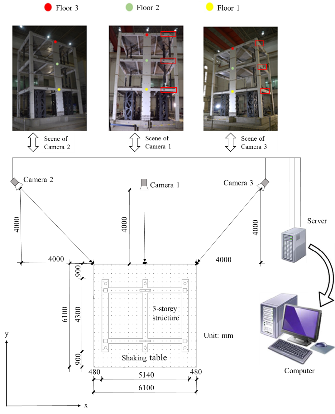 方法1被应用于3层钢筋混凝土框架结构的振动台试验,测试结构和相机的整体布局如图6所示。三台相机与振动台在x和y方向上的距离都为4000mm。在测试中,加载了1995年1月17日阪神大地震中神户市记录的名为JMA Kobe的地震波,四个工况下的峰值加速度分别为0.07 g,0.20g,0.40g和0.62g,在x和y方向连续加载。