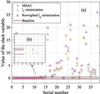 首先进行多视角估计性能比较,方法1中的加权lq最小化方法分别与主流的MSAC以及l1最小化方法进行对比。比较结果如图7所示,异常值去除能力可通过松弛数量的数量反映,通常将数值大于1e-7的松弛变量(见图7中基线),作为已去除的异常值。根据图8中结果,MSAC,l1最小化以及加权lq最小化方法去除的异常值数量分别为23,25以及25。为更加区分后两种方法的优劣性,可通过计算这两种方法松弛变量的绝对值之和,l1最小化以及加权lq最小化方法的数值分别为129.8258以及192.6778。这说明加权lq最小化方法去除异常值效果更佳。