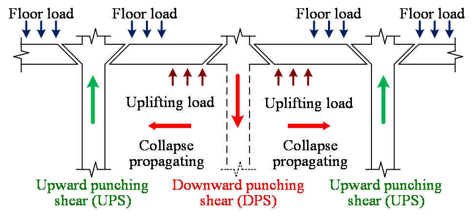板柱结构节点在倒塌过程中存在两种破坏模式(如图1所示):1) 向上冲剪破坏(Upward Punching Shear, UPS),呈倒锥形的破坏形态,一般由楼面超载引起的直接或间接的内力重分布造成的倒塌破坏;2) 向下冲剪破坏(Downward Punching Shear, DPS),呈锥形的破坏形态,由对板向上的作用力导致,可能由爆炸或飓风等因素引起。此外,由于连续倒塌触发原因和倒塌过程的复杂性,在内力重分布的作用下,相邻的板柱节点可能出现UPS和DPS两种破坏模式。以往板柱节点的研究还主要针对常规受力或抗震受力下的UPS破坏模式,如果需要研究板柱结构系统的连续倒塌,则需要对DPS也进行充分的研究。