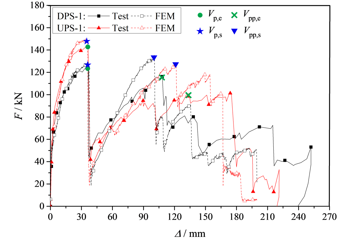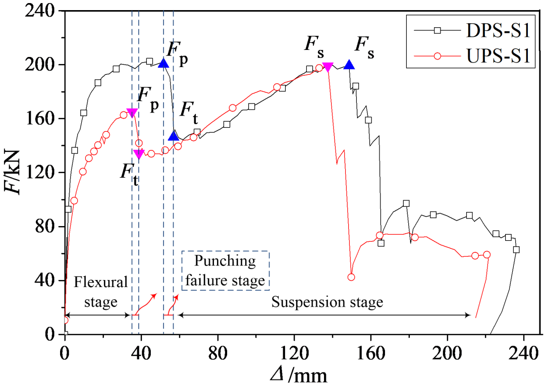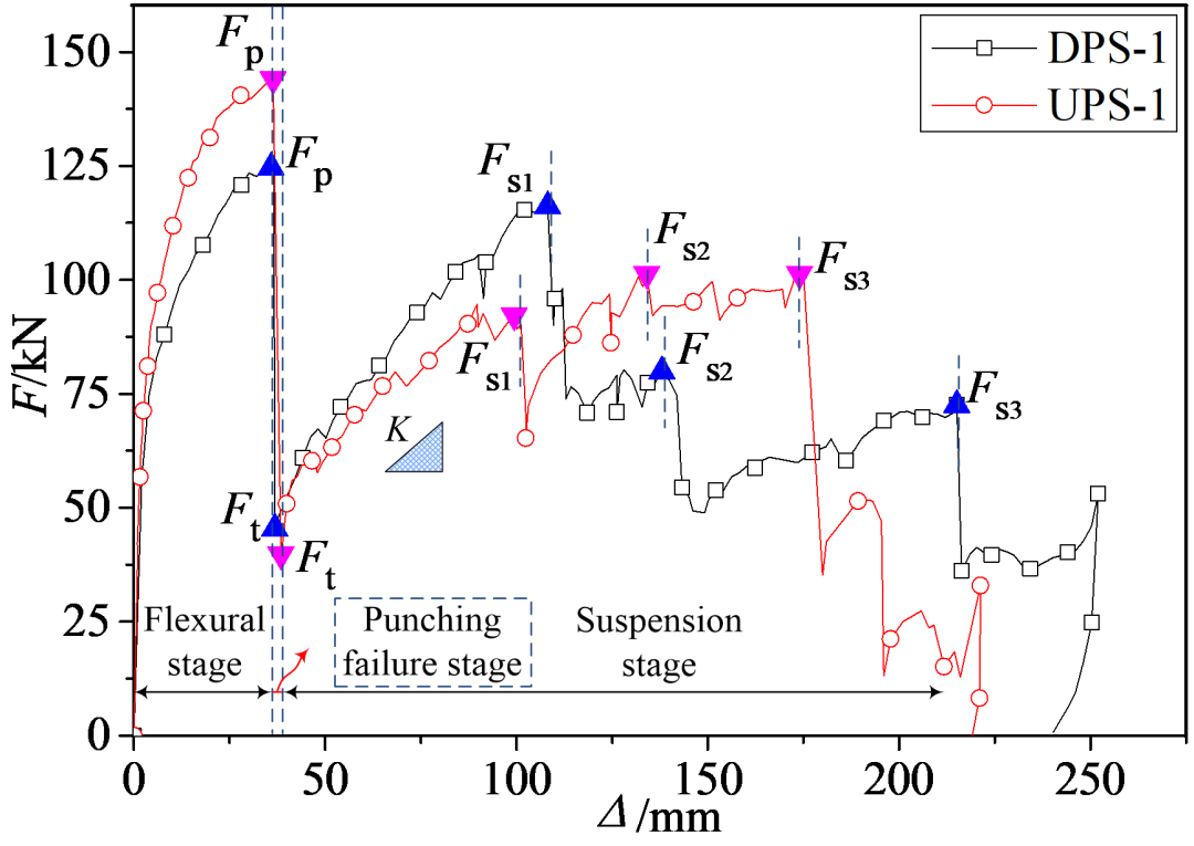 试件承载力-位移曲线及破坏模式如图4-6所示。不同冲剪破坏方向下无暗梁板柱节点受力性能有较大区别:1)由于负弯矩筋布置更加密集,UPS-1的抗冲剪承载力较DPS-1高16%;2)悬挂机制阶段,UPS-1整体性刚筋先断裂,数量较多的负弯矩筋能够在后期发挥较大承载力并导致悬挂机制的峰值位移加大,而DPS试件钢筋断裂次序相反;3)纵筋首次断裂后,UPS试件负弯矩筋从混凝土中拔出,而DPS试件整体性刚筋端部可靠约束仅部分从混凝土中拔出,负弯矩筋将楼板核心混凝土部分剪碎,两试件表现出不同的破坏机理,如图5所示。