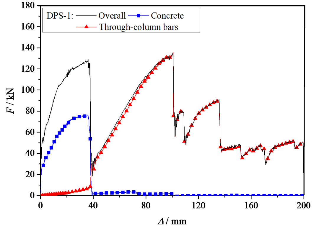 基于数值分析结果,图8给出了四个试件在冲切区内的混凝土以及六根穿柱钢筋对整体承载力的贡献。在冲切破坏发生之前,混凝土和钢筋这两种材料在冲切区域内协同工作。从图8所示的曲线可以看出,在所有试件中,冲切区内的混凝土贡献了约一半的承载力,而在所有试件中6根穿柱钢筋对总承载力的贡献均小于10%。在冲切破坏发生后,冲切区内的混凝土对承载能力几乎没有贡献,只起到对钢筋的锚固作用。在UPS-1和DPS-1的无暗梁试件中,冲切破坏后,穿柱纵筋的贡献占比达到99%之多。然而,对于UPS-S1和DPS-S1(图8(c)和(d)),由于箍筋提供的约束作用形式改善了结构的整体性,所以暗梁内的所有板内钢筋都对整体承载能力产生贡献。因此,6根穿柱钢筋的贡献降低到总承载的50%左右。