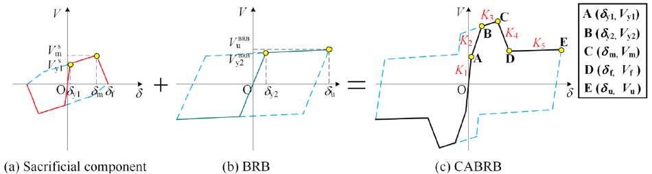 为此,本文提出一种新型两阶段受力可调控的屈曲约束支撑(CABRB),由牺牲段与耗能段并联构成(图1)。CABRB典型荷载–位移曲线如图2所示,通过牺牲段断裂机制引导支撑性能退化。该支撑在小震下具备足够刚度控制变形,在大震下通过降低刚度和承载力保证支撑的耗能效果。通过试验、理论与数值分析,验证了CABRB良好的抗震性能、修复能力及可调控的受力特性。