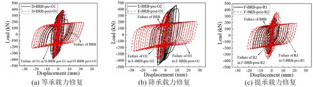 研究考虑了三种修复策略:等承载力、降承载力和提承载力,分别对应图6a、6b和6c。由图6a可见,等承载力修复后,CABRB的受力性能基本保持不变。图6b和6c表明,降低或提高承载力的修复策略均可有效实施,能够针对不同工程需求实现灵活的抗震修复与加固效果。
