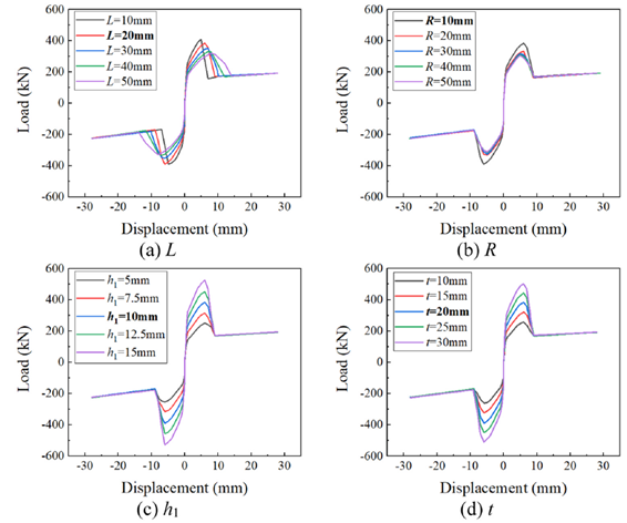 图8为牺牲板各设计参数对CABRB骨架曲线的影响。从图8中可知,牺牲板的峰值变形与破坏变形主要受参数L的影响,而对其他参数(即 h₁、t 和 R)不甚敏感。h₁ 和 t 对初始刚度与峰值强度具有显著影响,而 R 的影响较小。建议可在牺牲板设计时综合调整 L、h₁ 和 t。