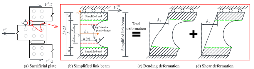 以带有长圆形开孔牺牲板的CABRB为例,本文结合虚功原理与增量分析方法建立了其理论骨架曲线模型。牺牲板的计算模型见图9,详细推理和计算流程可以参阅发表的论文。通过与试验所得滞回曲线(图5)对比,验证了所提出骨架曲线计算公式的准确性与适用性。