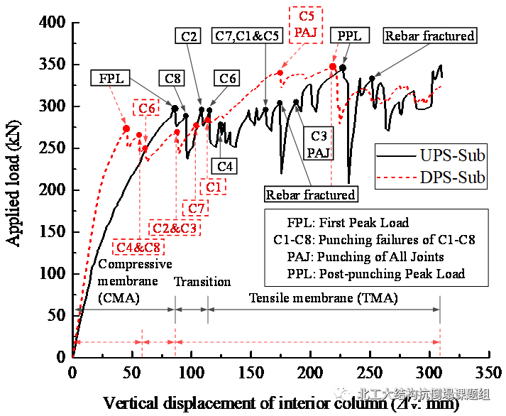 (1)在集中加载阶段阶段,UPS-Sub和DPS-Sub的分别表现为局部和整体失效模式。UPS-Sub的中柱节点冲剪承载力比DPS-Sub高58.2%,但对应的冲剪位移UPS-Sub比DPS-Sub低53.6%。然而,两个试件的中柱节点冲剪承载力均显著低于规范预测值。