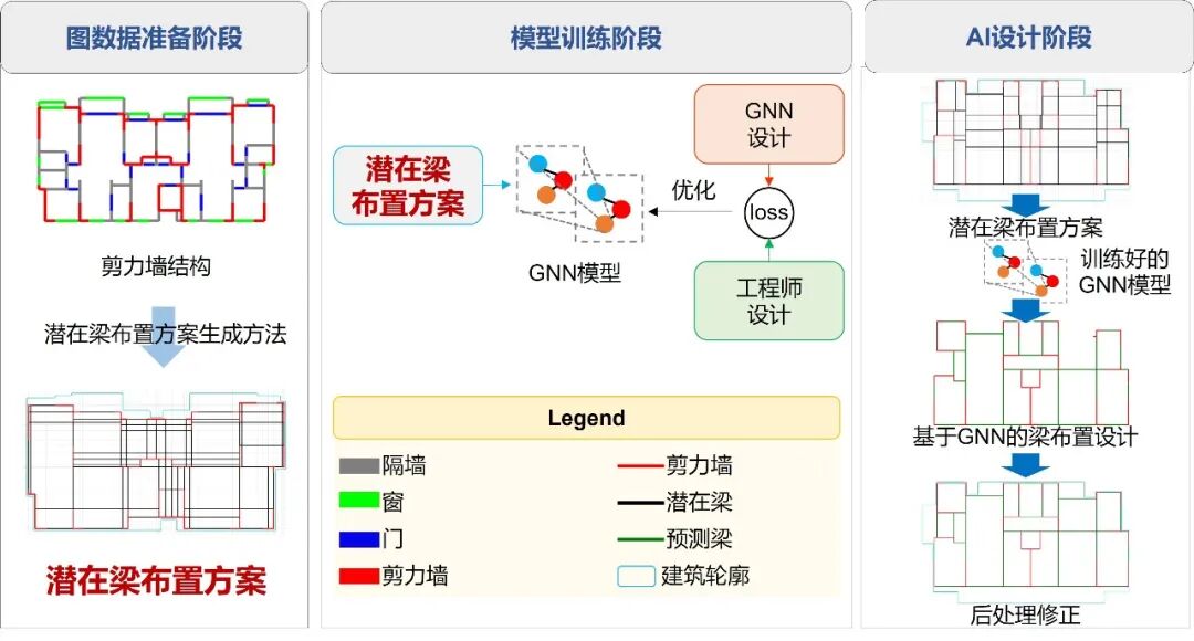 (3)AI设计阶段:基于GNN模型实现剪力墙结构的梁布置设计。