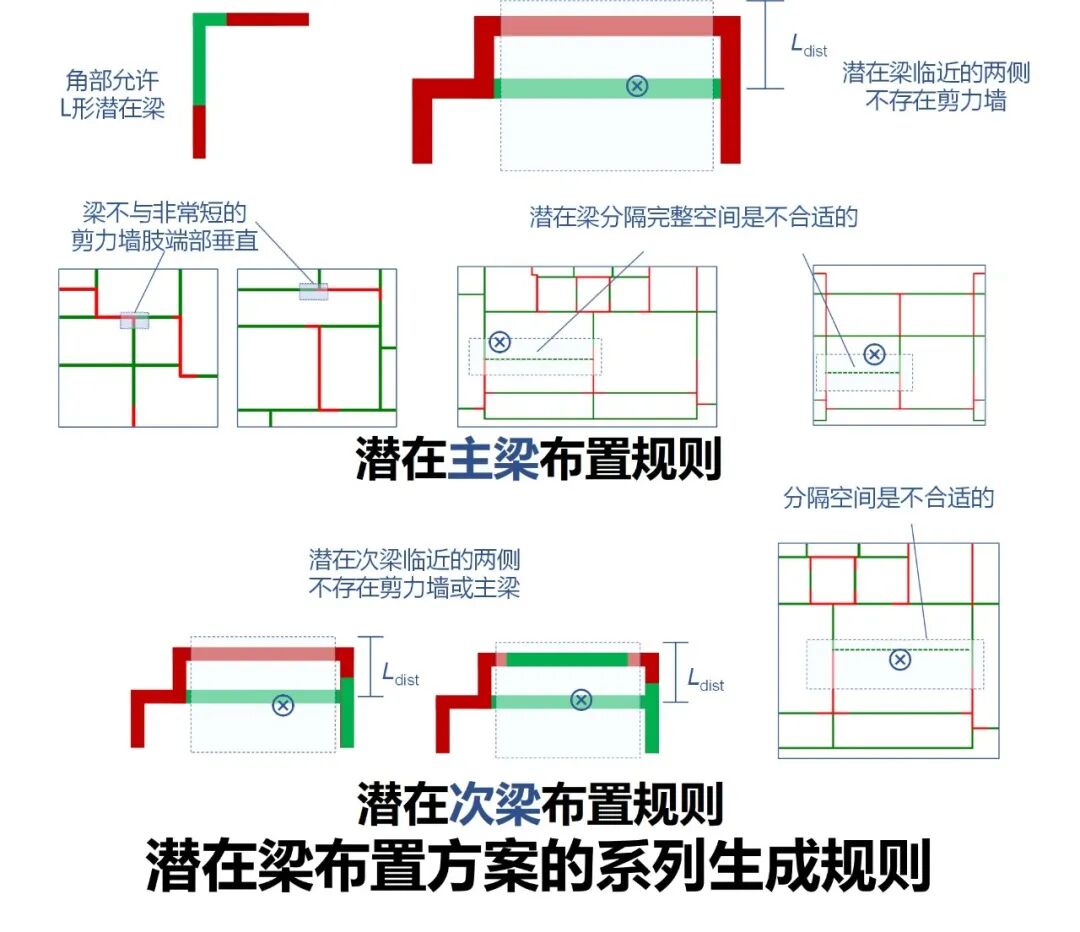 然而,直接基于剪力墙的布置去预测梁在剪力墙上的布置形式,会面临几乎无限的梁布置的可能性空间,这无疑极大增加了图的复杂度,增加了预测的难度。因此,本研究提出了考虑结构和建筑构件的空间布置以及工程师经验的潜在梁布置场景生成方法,以有效减少梁布置场景的可能性空间。测试案例表明,本研究所提出方法布置的梁和工程师设计相比具有高相似性。