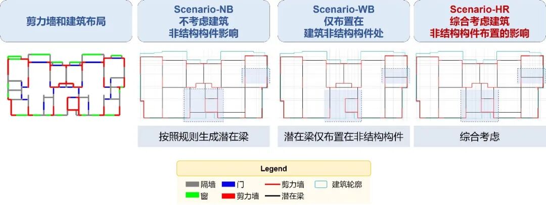 Scenario-NB(No Background),不考虑隔墙、门窗等非结构构件(即“建筑布置背景”)对梁布置的影响;