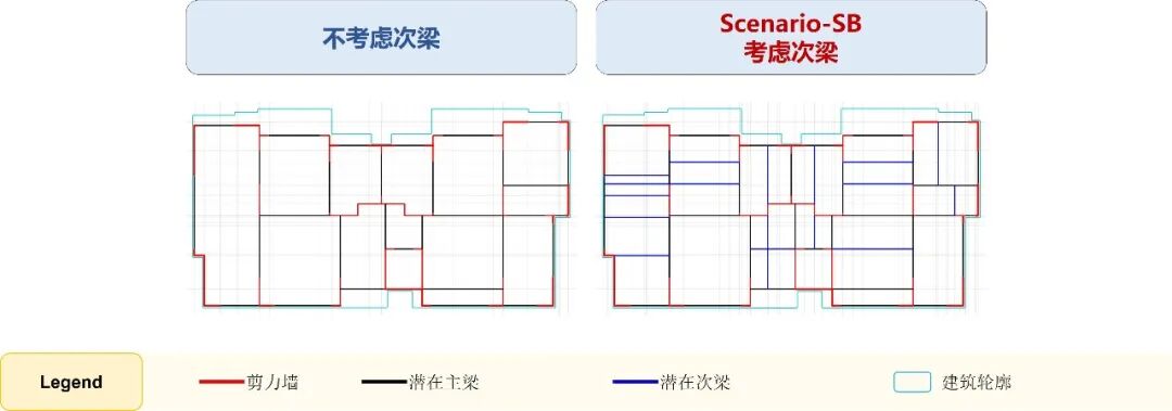 Scenario-WB(With Background),考虑“建筑布置背景”对梁布置的影响,仅在填充墙、门窗等构件的位置布置梁;