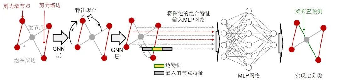 本研究中,剪力墙结构的梁布置对应的是边分类的任务,因此在我们之前使用GNN进行剪力墙布置方案设计的研究基础上,提出了适用于剪力墙结构梁布置方案设计的GNN模型,如图7所示。
