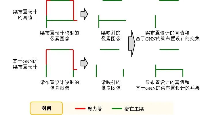 我们采用基于IoU的指标IoUbeam来评估GNN设计结果的空间布置质量,IoUbeam是梁布置设计的真值和基于GNN的梁布置设计的交集和并集的比值,可以用来评判GNN方法的梁布置设计和工程师的梁布置设计的相似度,示意如图8所示。