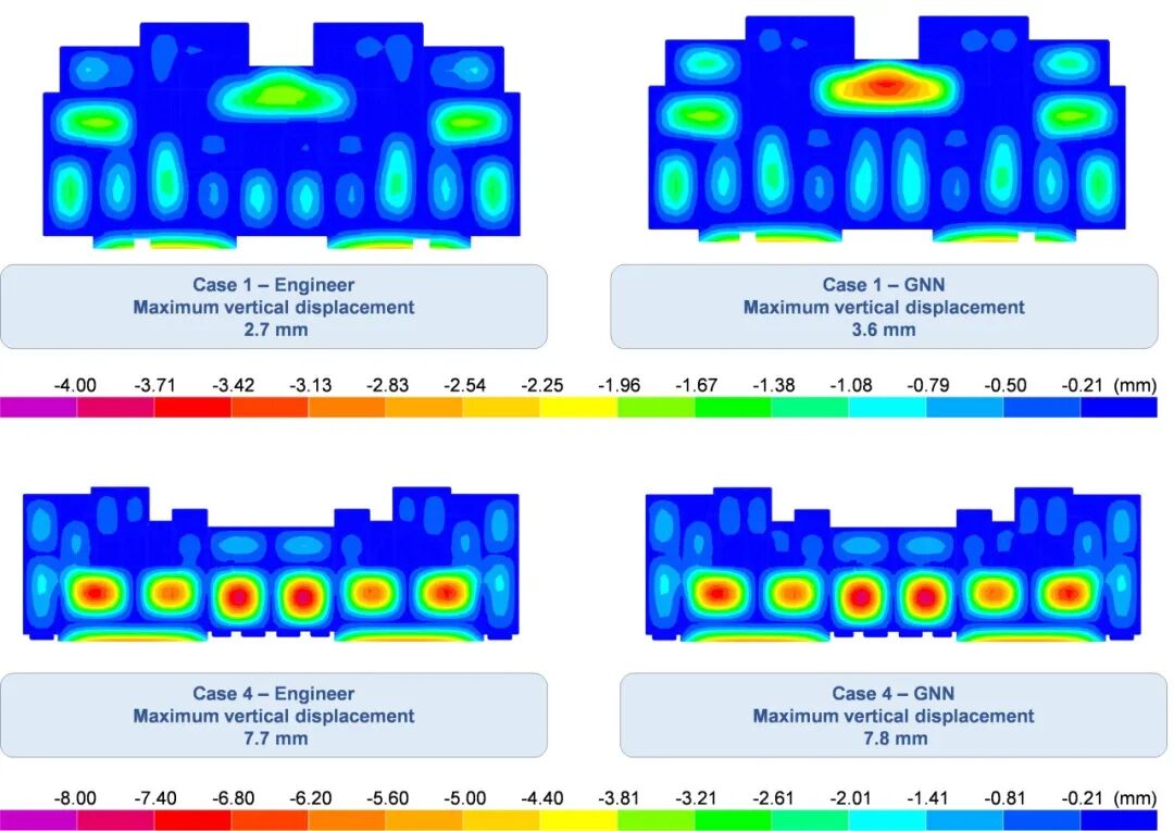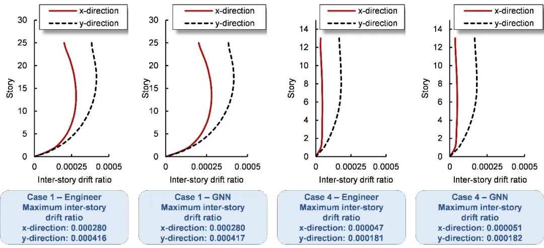 选取其中Case 1和Case 4作进一步的力学分析。Case 1为8度设防,结构高度为75 m。Case 4为7度设防,结构高度为39 m。Case 1和Case 4的层高都是3米。Case 1 - Engineer和Case 4 – Engineer表示工程师设计的梁布置结果,Case 1 - GNN和Case 4 – GNN表示GNN方法设计的梁布置结果。
