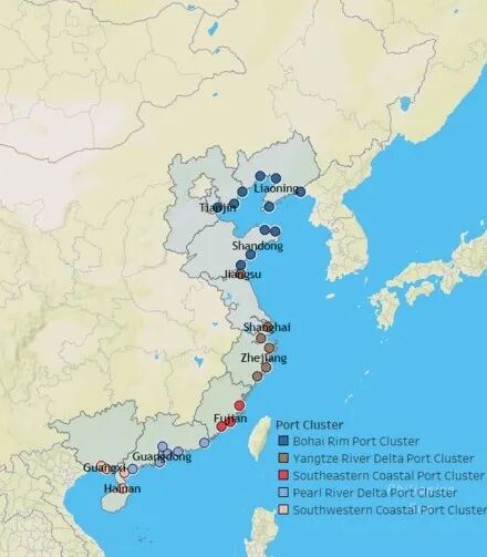 我们将上述经济损失评估框架,应用于中国沿海地区的31个集装箱港口。本研究计算了自2006-2020年以来,台风引起的港口中断造成的港口层面与区域层面的直接经济损失和间接经济损失。图2 中展示了31个集装箱港口的空间分布情况与各自所属的港口群。本论文原文中详细介绍了本研究方法所需要的数据类型、指标选取方式及数据来源。由于篇幅有限,在此不做详细列举,感兴趣的看官请移步原文。
