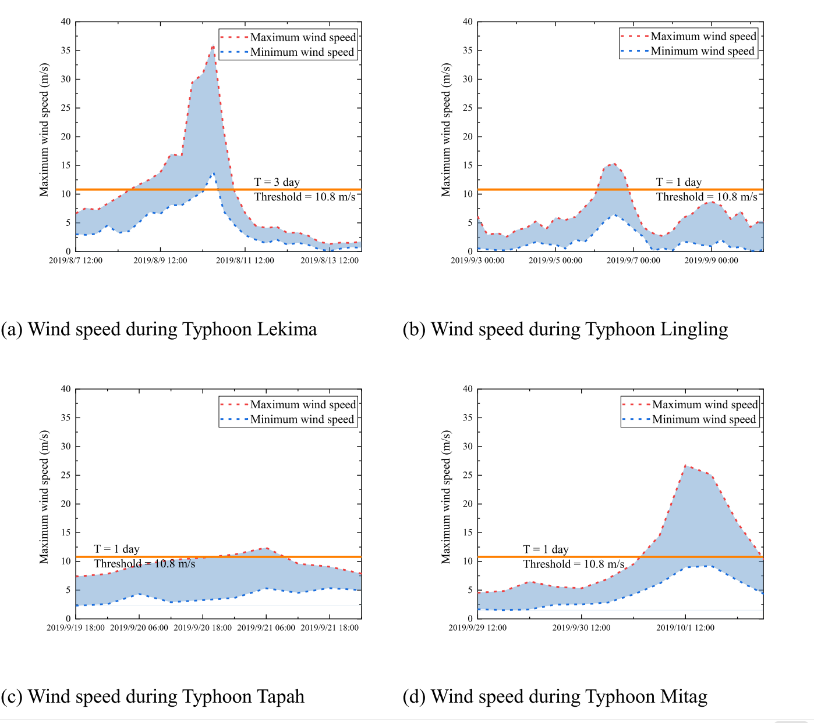 (1)本文对风场模型与港口中断时长进行了验证。如图3所示,本文选取了T2004、T1918、T1909三场台风期间的风速实测值与计算值进行对比。以上海港2019年的运营情况为例,我们的计算模型成功识别了T1909、T1913、T1917、T1918四场台风对港口造成的影响。图4中展示了2019年间所有的台风路径,其中对港口无影响的台风路径为灰色,对港口有影响的台风路径为彩色。图5中展示了四场台风期间,本模型计算得到的港口风速监测区域内的最大风速与最小风速。