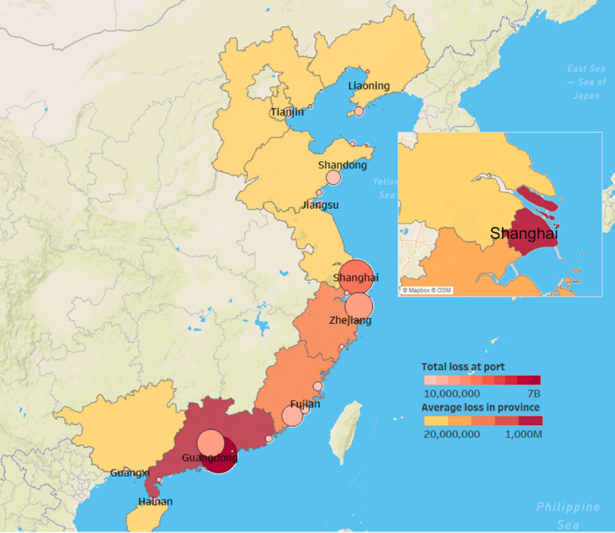 图6 2006-2020间港口的总经济损失与各省(市)的平均经济损失