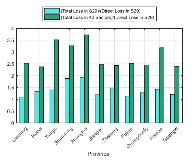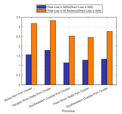 (4)基于投入产出模型,计算港口运营中断造成的省级尺度的间接经济损失。在上述基础上,评估区域尺度与港口群尺度的台风经济损失大小以及损失的放大效应。