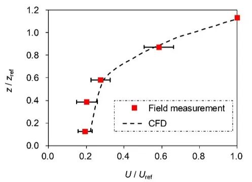 采用文献中对一片15 m高松树林内平均风速和湍流数据的实测数据验证本研究中计算流体力学模拟方法的准确性。模拟得到的顺风向风速U与实测值的比较情况如图2所示。模拟得到顺风向风速与实测值吻合良好,说明本研究采用的计算流体力学模拟方法可以较为准确地模拟树木对整个风场的影响。