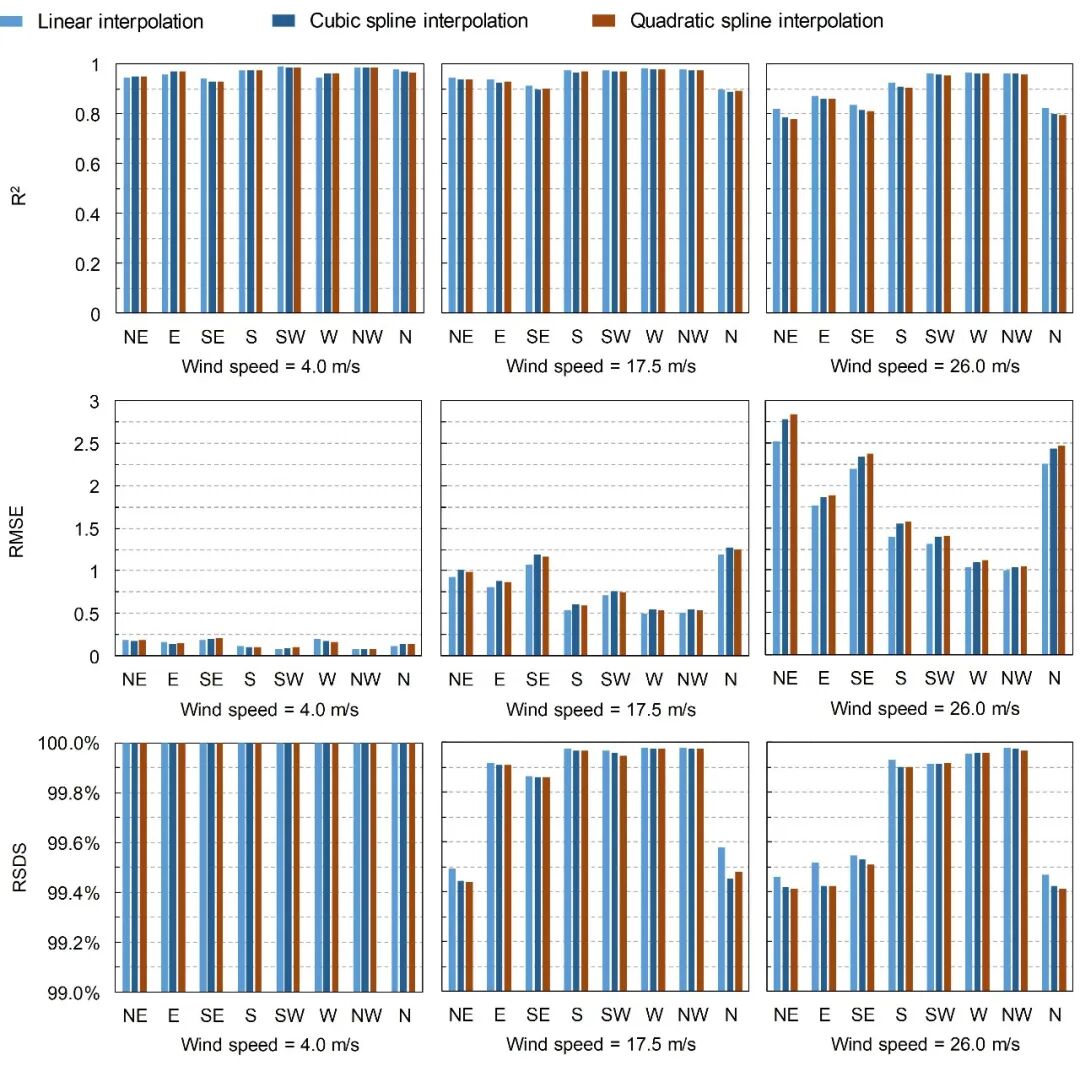 本研究最终采用了线性插值方法用于近实时预测树顶风速。实际上,我们讨论了3种不同的预测算法:线性插值、二次样条插值和三次样条插值(自然边界条件),以比较不同预测算法的优劣。在原有情境库的基础上,本研究进一步补充了24个模拟案例作为验证集。不同预测方法对于树顶风速指标的拟合优度采用决定系数 (R2) 和均方根误差 (RMSE) 来度量;对于树木破坏状态指标的拟合优度采用同破坏状态的树木比例(RSDS)来度量。树木的破坏状态定义为三类:无破坏、树干折断和整体倾覆。