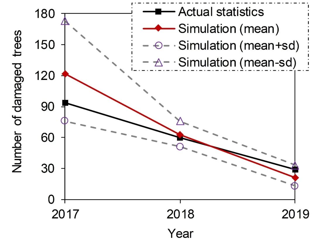 我们采用清华园2017、2018、2019年每年在强风荷载下发生破坏的树木数量来验证本研究所提出的树木风致破坏模拟方法的准确性。考虑到树木的树干密度、抗折强度、抗拔系数这三个参数的不确定性会对树木破坏的预测结果造成较大影响,我们分别在上述参数取平均值、平均值加一倍标准差、平均值减一倍标准差情况下比较了模拟得到的树木破坏数量与实际统计值的差异,如图4所示。