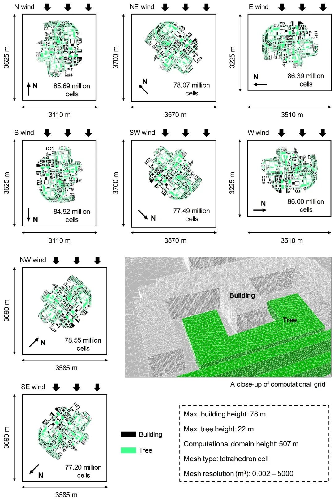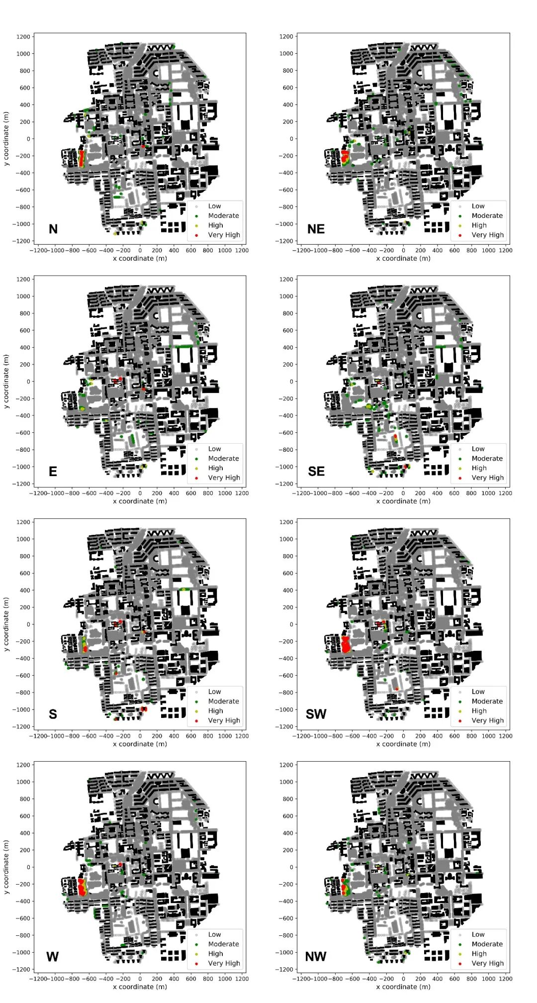 基于清华园建筑和树木数据,我们建立了清华园的计算流体力学模型,并据此构建了清华园计算流体力学模拟情境库。情境库共计考虑了7个风速情境(即10 m高风速为0 m/s、5 m/s、10 m/s、15 m/s、20 m/s、25 m/s、30 m/s)和8个风向情境(即N、NE、E、SE、S、SW、W、NW),共计56个情境。不同风向情境的模型平面图如图6所示。