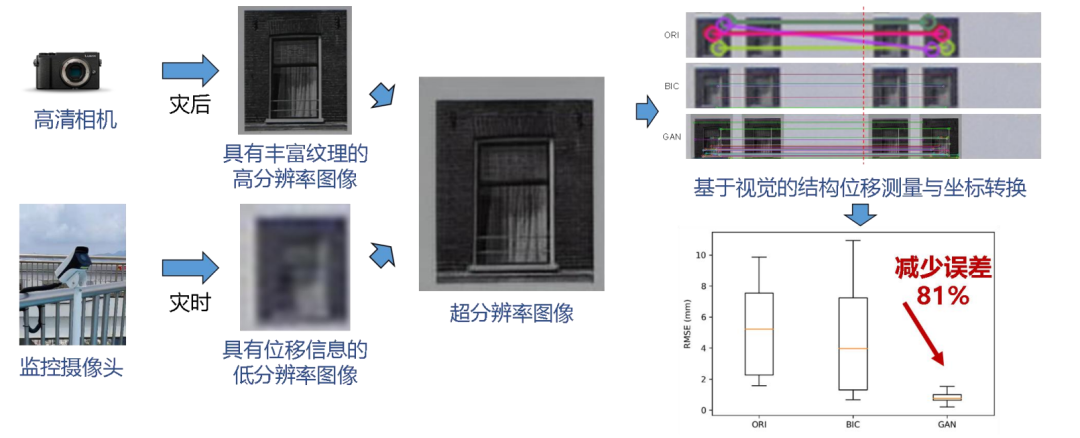 对于灾时,提出了一种基于生成对抗网络的超分辨率方法,从而提升灾时建筑结构的位移测量精度,见图5(b);