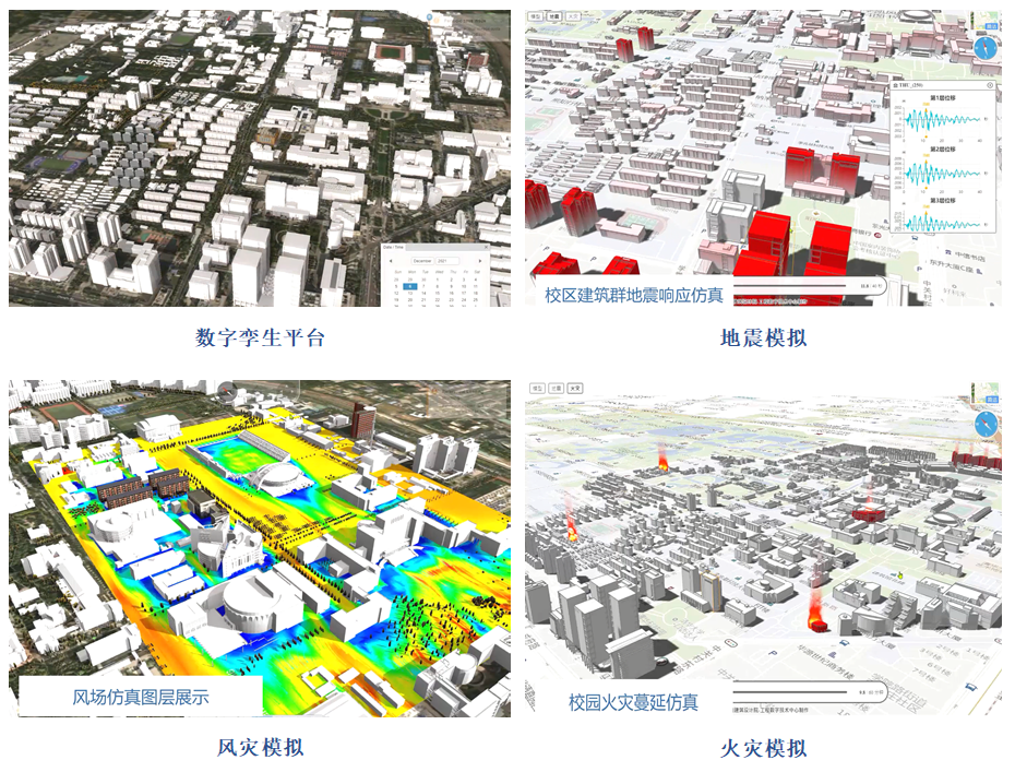 本研究基于数字孪生开展了两项工程应用:(1)支撑了南方某超高层异常振动事件调查;(2)搭建了某大学校园多灾害推演数字孪生平台助力校园防灾。