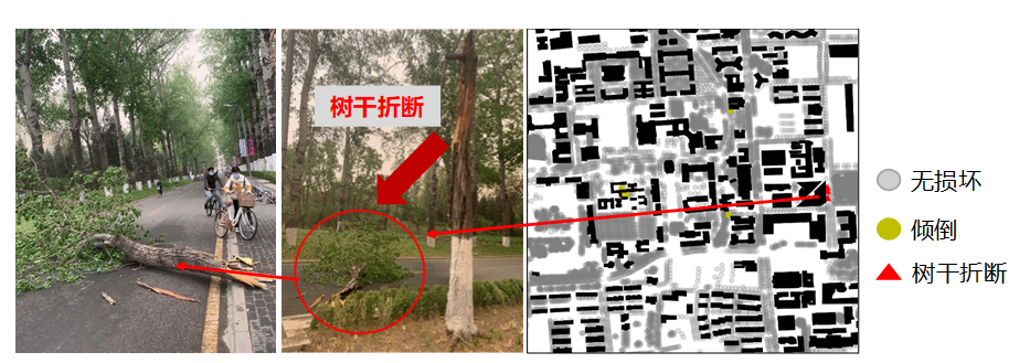 通过搭建某大学校园多灾害推演数字孪生平台,高真实感展示校园区域在地震、风灾、火灾等多种灾害下的推演结果,为校园灾前规划、灾时评估等决策行为提供技术支撑(图11),并对2021年4月15日强风下的校园树木破坏进行预测,后调查风损情况和预测情况吻合良好(图11)。可见,数字孪生技术服务于实际防灾减灾应用具有良好前景。