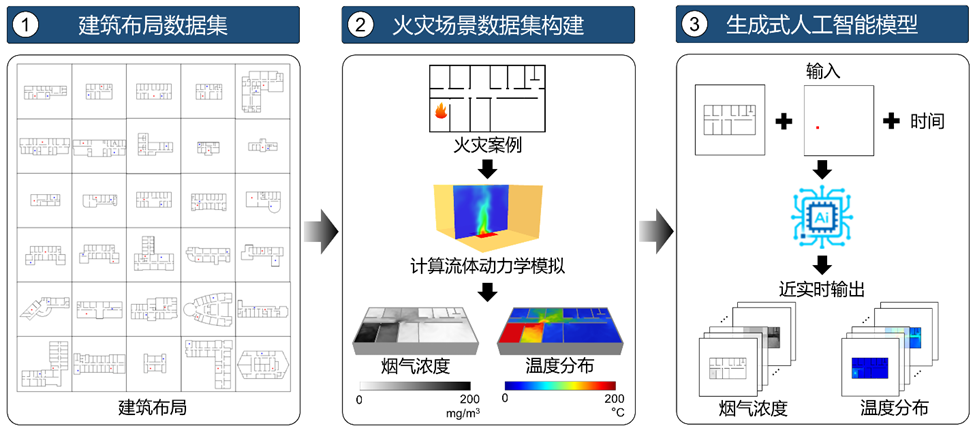 基于性能的消防安全评估旨在通过分析建筑火灾场景来确保全面的消防安全。由于传统的计算流体动力学(CFD)火灾模拟计算量大、耗时长,分析的场景数量受到限制,通常仅基于最坏情况假设来选择火灾位置。本文提出了一种利用生成人工智能(Generative AI)来预测复杂建筑布局下的火灾场景,快速模拟烟气运动和温度分布的结果(图1)。