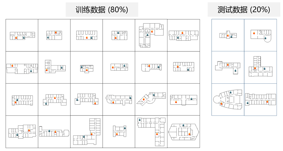 通过在同一建筑内设置不同的起火位置,构建了一个多样化的数据集,这不仅有助于模型学习建筑几何形状,还能学习不同起火位置对火灾场景的影响。该数据集按8:2比例划分为训练集(48个案例)和测试集(12个案例),如图2所示,其中训练集用于模型参数学习,测试集用于验证模型泛化能力。