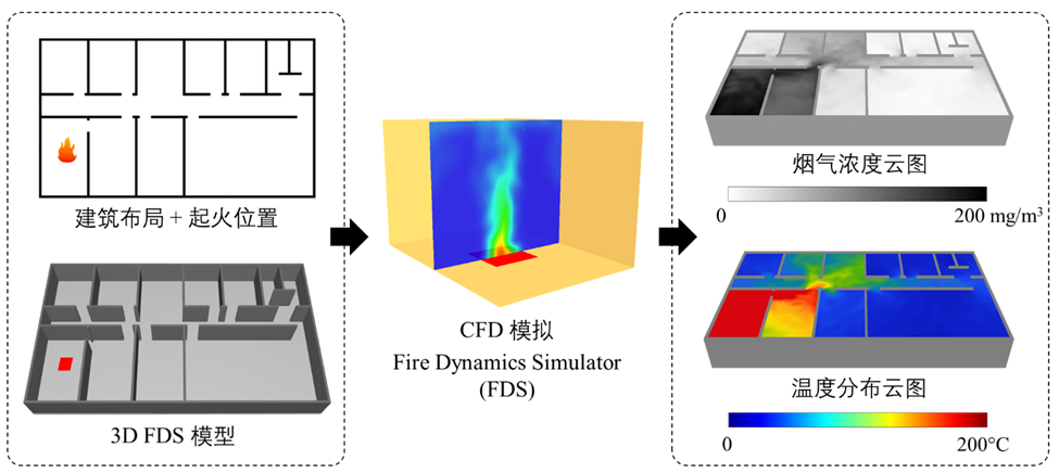 对建筑设计进行消防安全评估是消防安全工程领域的重要挑战,因为建筑的总体形状、内部隔断和房间布局等因素都会影响火灾发生时的烟气和热量的蔓延。传统的消防安全评估方法,特别是在基于性能的消防安全设计过程中,通常依赖于计算流体动力学(CFD)模拟来分析火灾场景。然而,每个建筑设计方案中可能发生的火灾场景数量极为庞大,若采用CFD方法对所有潜在场景进行评估,不仅计算量巨大且计算时间长。因此,需要一种更高效和实用的替代方法来评估消防安全。