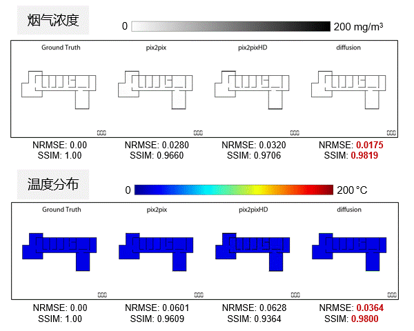 Pix2pix、pix2pixHD和diffusion三种不同模型生成的典型案例(AI未见过的建筑布局)结果的烟气浓度和温度分布分别如视频1和图6(测试案例1)以及视频2和图7(测试案例2)所示。