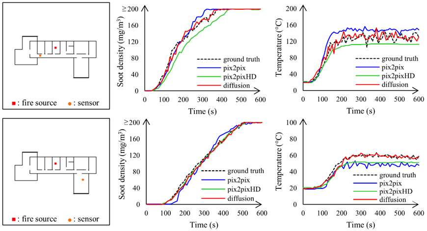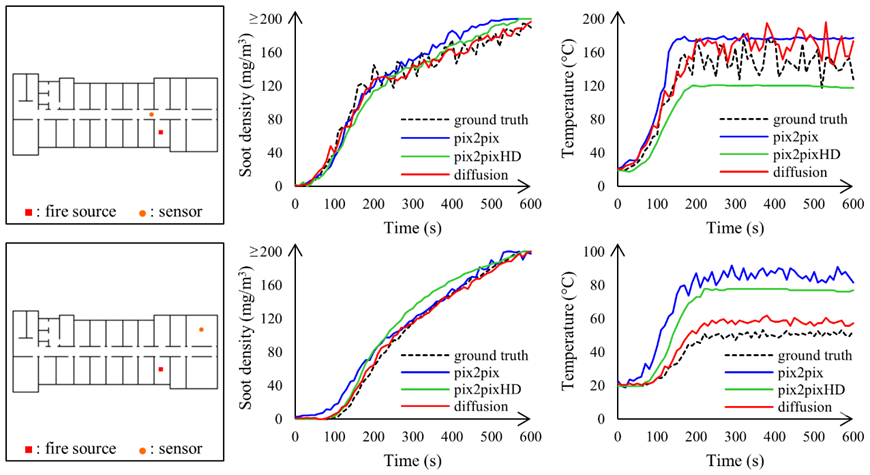 本研究采用三种用于图像生成的生成式人工智能模型:基于生成对抗网络(GAN)的pix2pix和pix2pixHD,以及扩散模型。这些模型从海量CFD数据集中学习烟气运动和热量分布模式,经过训练后,在对新的未见过的建筑布局进行测试时,这些模型展现出了卓越的准确性,并提供了近乎实时的评估结果。