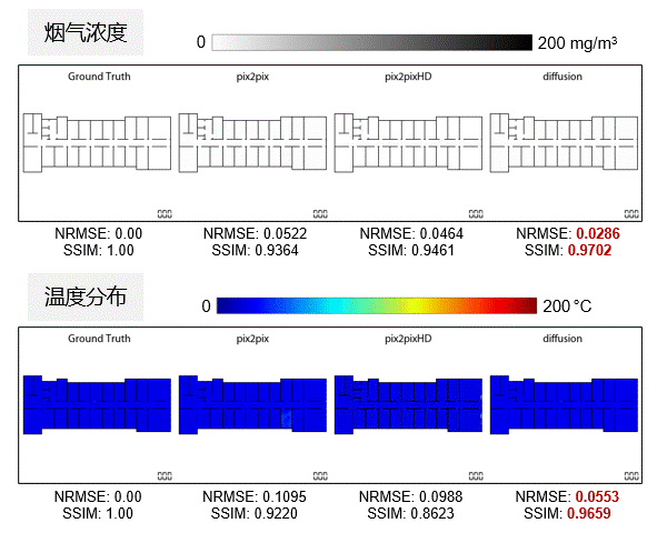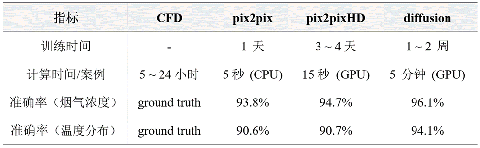 测试结果表明,扩散模型生成的火灾场景比GAN更为准确,准确率高达94%。不过,扩散模型的计算时间相对较长,需5分钟才能生成一个案例的结果,而GAN的pix2pix仅需5秒。
